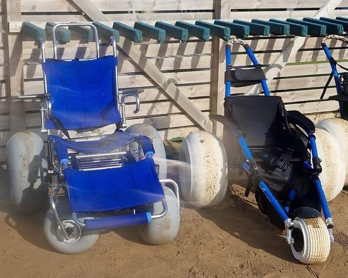 We have two styles of beach wheelchair, a Hippocampe and a Wheeleez. The Hippocampe is low down but very comfortable and suits a child to an adult approximately 6ft tall. This wheelchair has a push handle as well as a pull cord at the front making navigating beach soft sand easier.